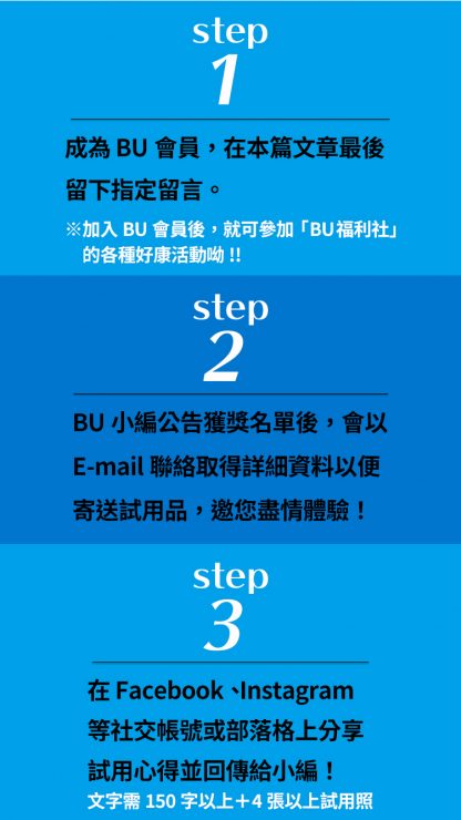 ※享受福利後未回報感想者,以後將列入BU福利社黑名單,喪失往後參與BU福利社體驗資格。