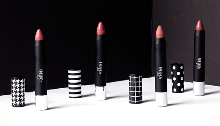 以女孩化妝台為思考的台灣彩妝品牌-「FreshO2」,向來唇彩商品受到高度注目,所有商品皆針對女孩化妝所在意之需求為初衷,這次FreshO2特別以經典時尚的摩登幾何元素融入於唇彩,不僅總是以「具有設計感的包裝」深植人心,在「質地」與「色澤」的反覆測試與研發,也成為美妝社群高度討論的話題,翻玩幾何線條打造唇彩美學, 推出經典再現的時尚彩妝,充滿潮流指標唇蠟筆,讓隨身描繪、上色、疊色百變玩美,搭配深刻的黑白對比,時尚不僅侷限於穿搭,更是躍上每個人的唇,展演各種不同自我風格。